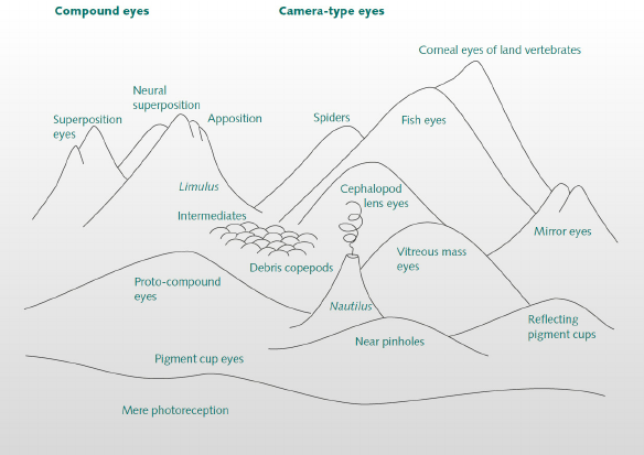 Richard Dawkins described such path dependence as analogous to climbing a mountain with several peaks. Once you begin climbing a certain path, this might lead you to scale one peak within a landscape containing several. However, evolutionary processes are gradual, and bar jumping directly between peaks. Animals may gradually lose and re-evolve eyes (as snakes have repeatedly done) but an animal will not give birth to children with a different type of eye structure.